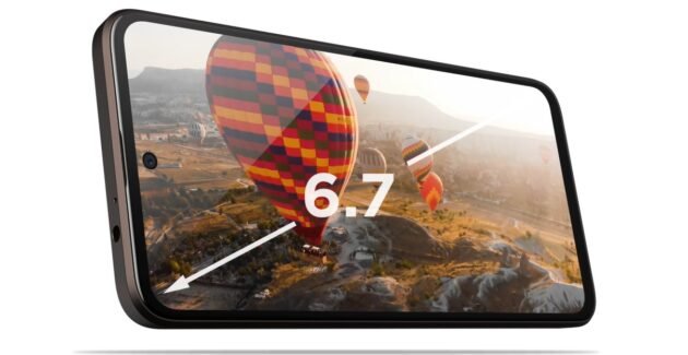 الشاشة: شاشة OLED بقياس 6.70 بوصة، بمعدل تحديث 120 هرتز، ودقة 1080×2400 بيكسل، ونسبة عرض إلى ارتفاع 20:9، وكثافة بيكسلات 393 نقطة في البوصة.